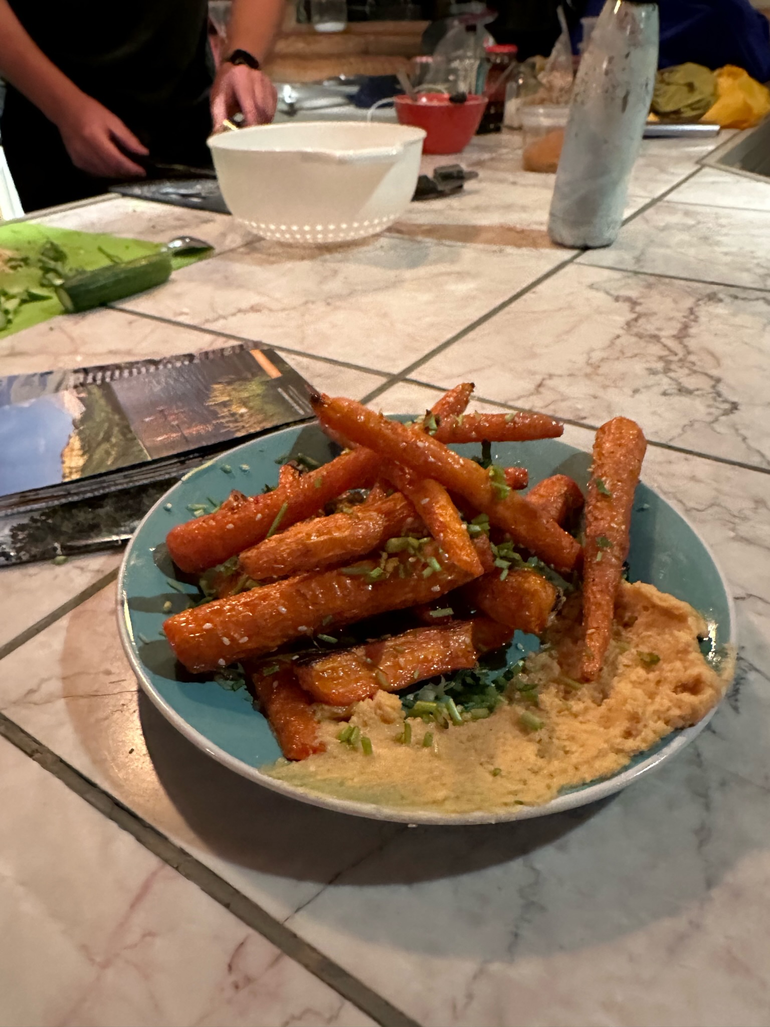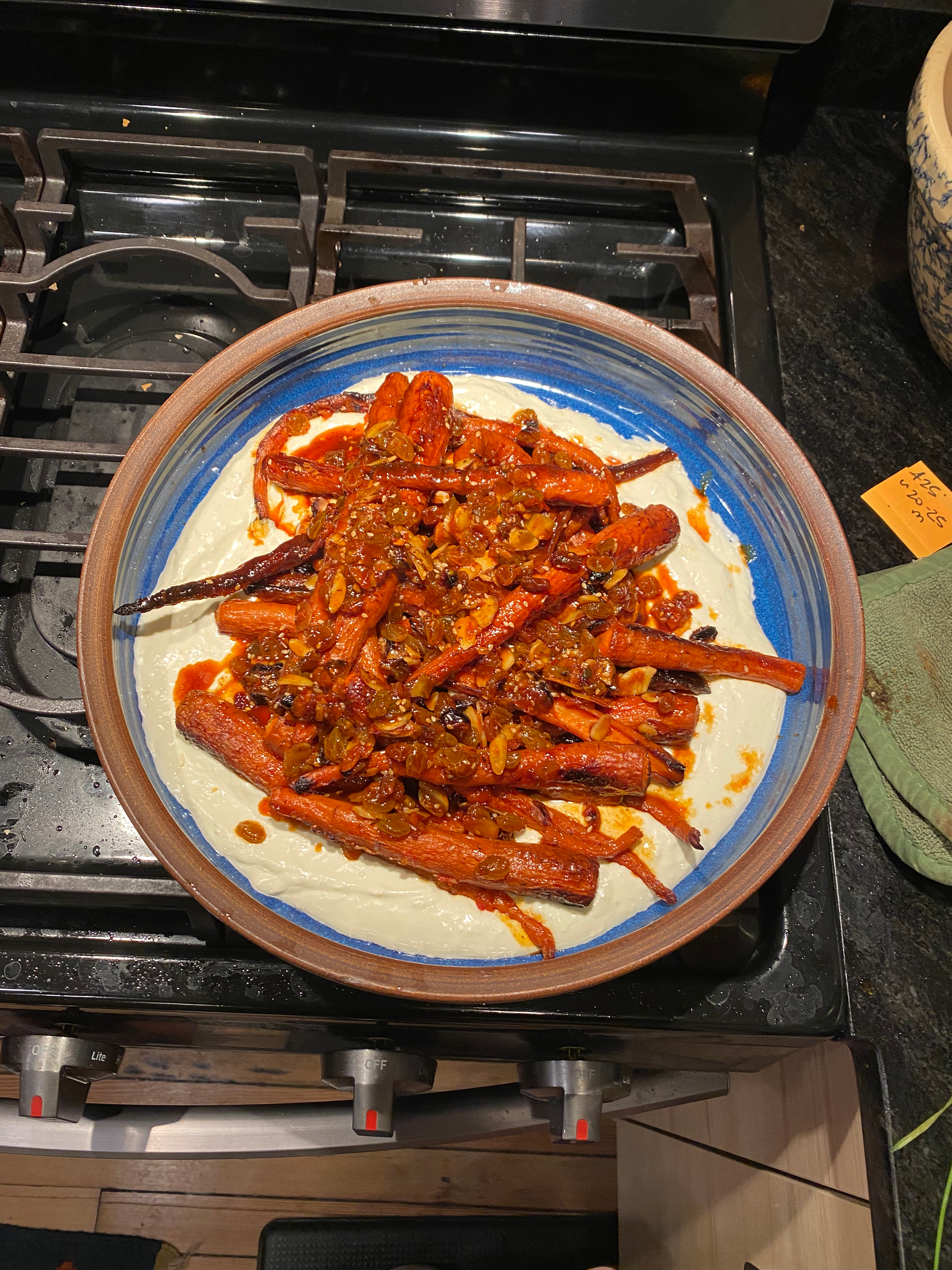 top with carrots and finish with remaining zaatar glaze and garnish of your choice or herbs nuts or nothin